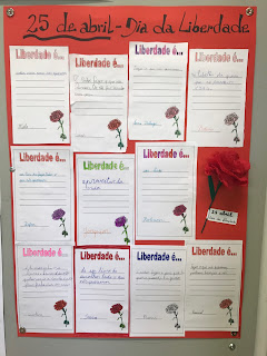 - Dialogámos sobre os acontecimentos relatados, fazendo o levantamento do vocabulário relativo ao tema (ditadura, revolução, liberdade, cravos, Portugal, resistência, censura...);
